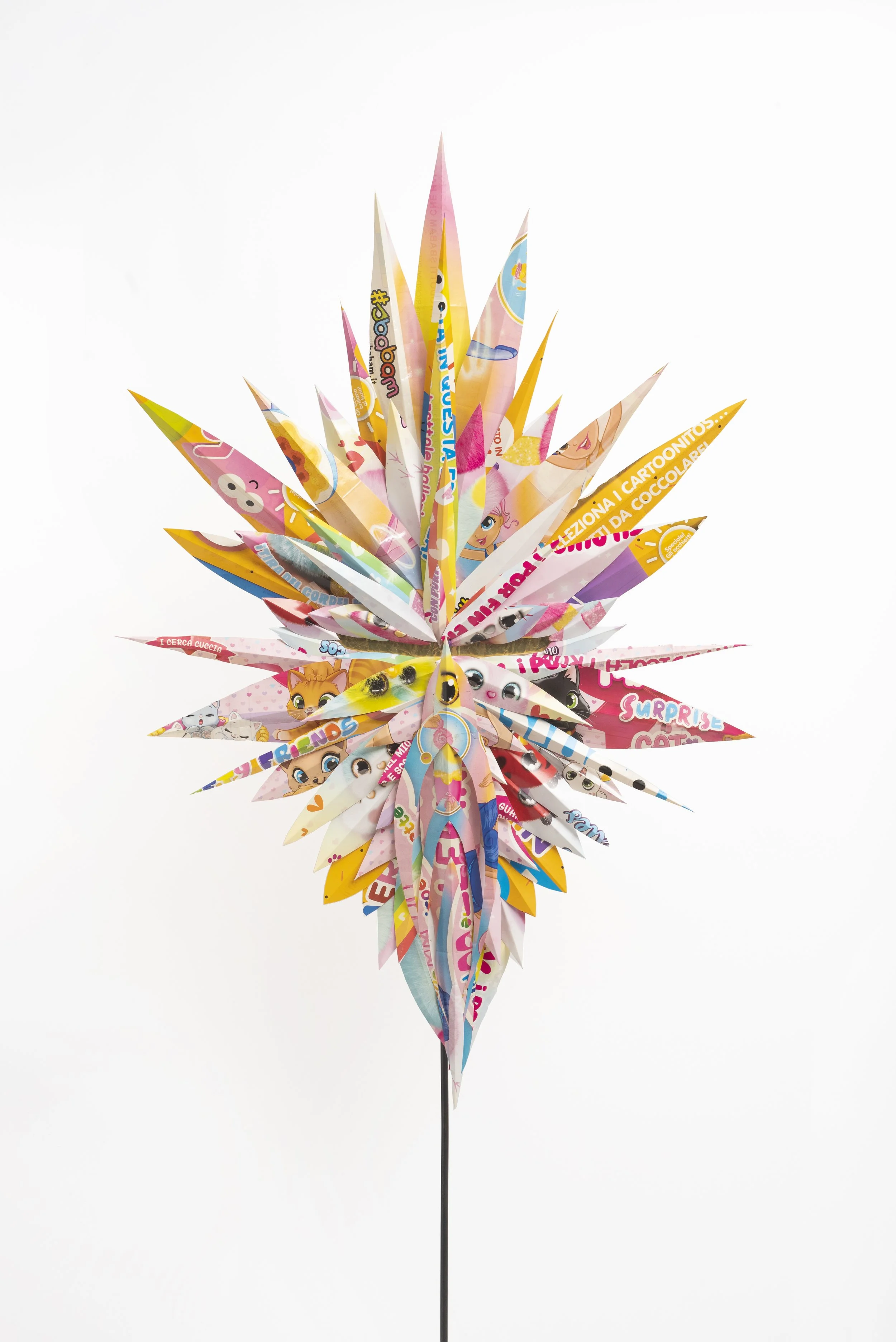 A series of masks made from waste materials sourced from newsstand posters and toys provided by a partner company. Part of the project was also developed as creative workshops, while the masks themselves constitute a personal production, born from experimentation with recycled materials, playful forms, and the pop graphics of children’s advertising.